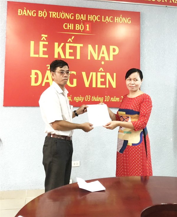 Được sự thống nhất của Ban thường vụ Đảng ủy khối, Đảng ủy trường đại học Lạc Hồng, Sáng ngày 03/10/2019 tại văn phòng họp cơ sở 1, Chi bộ 1 đã tiến hành tổ chức lễ kết nạp Đảng viên cho quần chúng xuất sắc Nguyễn Ngọc Hải vào Đảng Cộng sản Việt Nam; Đến dự buổi lễ kết nạp có Đ/c Đào Thanh Mai – Bí thư Chi bộ 1, cùng toàn thể Đảng viên trong Chi bộ.
