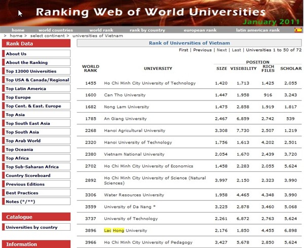 Theo Webometrics- một  trang web chuyên xếp hạng website các trường đại học thế giới (http://www.webometrics.info/) của Phòng thí nghiệm điều khiển học thuộc Hội đồng Nghiên cứu Quốc gia của Tây Ban Nha, Việt Nam có 71 trường ĐH có trang web trong danh sách xếp hạng của webometrics với thứ hạng từ 1602 đến 11.996. Trong đó đứng đầu là Đại Học Cần Thơ, tiếp theo có các trường Đại học Bách Khoa TP. Hồ Chí Minh; Đại học Quốc gia Hà Nội; Đại học Khoa học Tự nhiên TP. Hồ Chí Minh; Đại học Bách Khoa Hà Nội… Đại Học Lạc Hồng của chúng ta vinh dự đứng thứ 13 trong bảng xếp hạng của các trường ĐH tại Việt Nam.