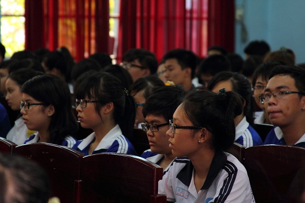Các em học sinh lắng nghe trả lời của Ban Tư vấn