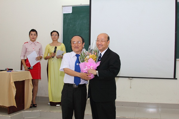 TS. Diệp Cẩm Thu thay mặt BLĐ tặng hoa cho Thầy Fumio Okita