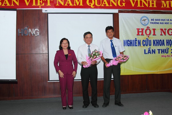 NGƯT.TS Nguyễn Thị Thu Lan – Chủ tịch Liên hiệp các Hội Khoa học Tỉnh Đồng Nai – Phó Hiệu trưởng nhà trường; TS. Nguyễn Vũ Quỳnh – Trưởng phòng NCKH – Trưởng Khoa Cơ điện Điện tử; cùng quý thầy cô trong hội đồng khoa học của nhà trường.