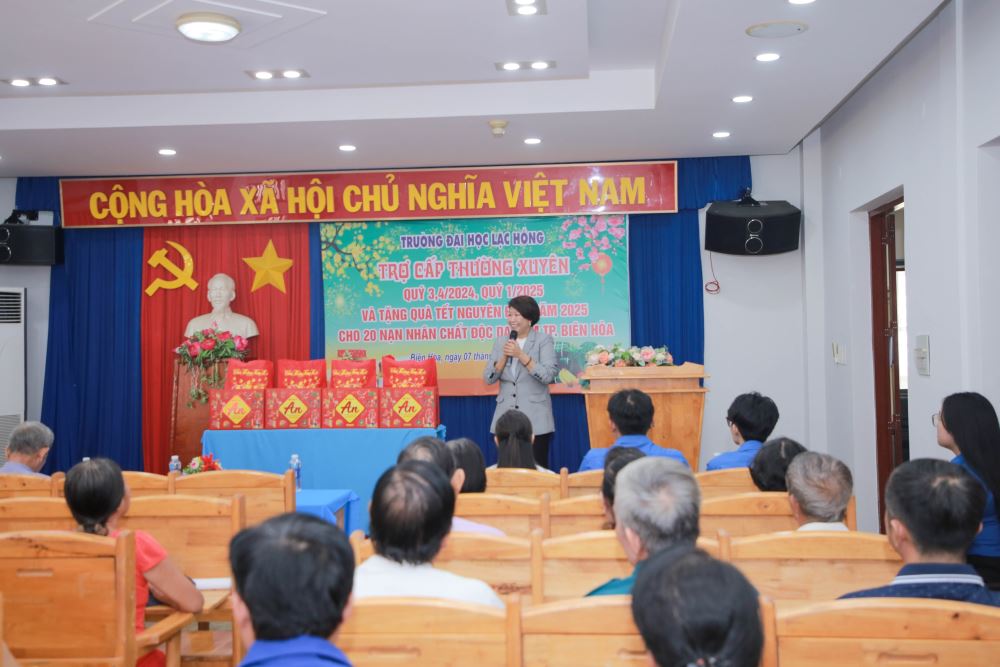 Sáng ngày 07/01/2025, tại trụ sở Ủy ban Mặt trận Tổ quốc Việt Nam và các Đoàn thể TP. Biên Hòa, Trường Đại học Lạc Hồng (LHU) đã tổ chức buổi lễ trang trọng và đầy ý nghĩa, trao trợ cấp thường xuyên quý III, IV/2024 và tặng quà Tết Nguyên đán năm 2025 cho 20 nạn nhân chất độc da cam/dioxin trên địa bàn TP. Biên Hòa. Tổng giá trị hỗ trợ trong đợt này lên đến 84 triệu đồng.