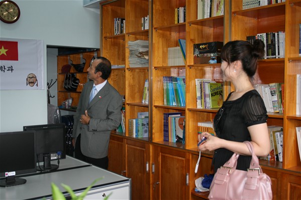 Sau buổi lễ, ông Lee Uk Heon cùng các thầy cô ngành Hàn Quốc học và các bạn sinh viên đã tham quan phòng tư liệu Hàn Quốc. Hy vọng, sự thành lập phòng tư liệu Hàn Quốc sẽ mang lại cho các bạn sinh viên cơ hội được học tập, tìm hiểu và nghiên cứu tốt.
