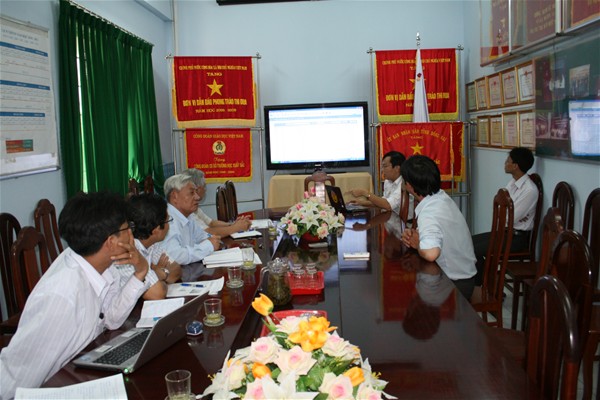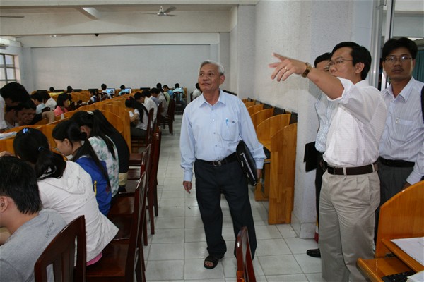 GS.TSKH Ngô Văn Lược (người ngồi giữa) nhiệt tình trao đổi với thầy Lâm Thành Hiển và thầy Huỳnh Cao Tuấn những vấn đề về hệ thống mạng của trường